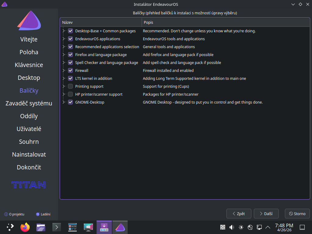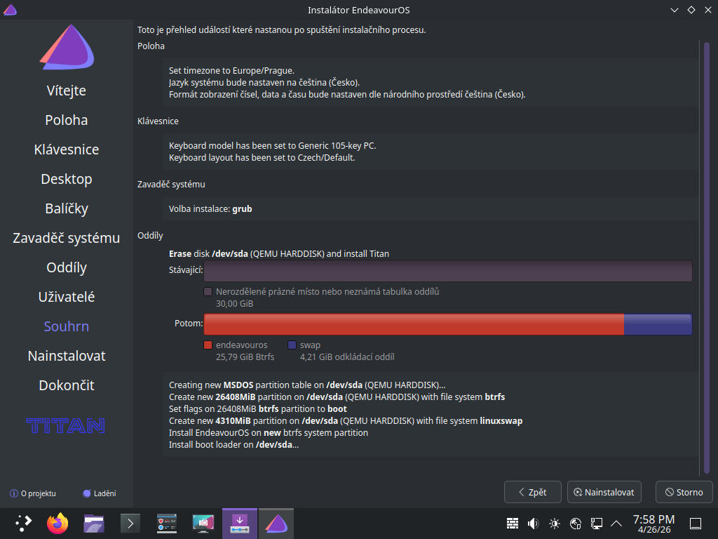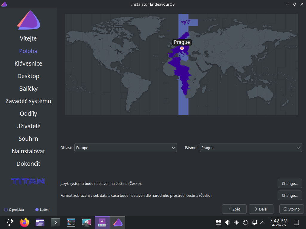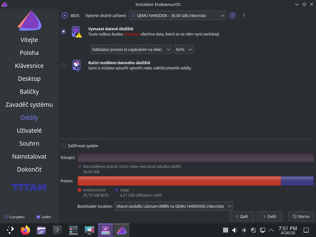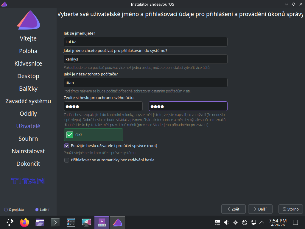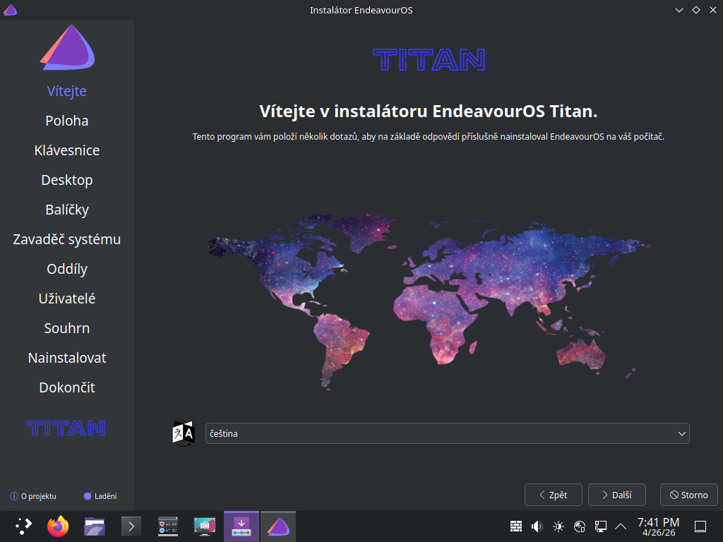 Instalátor (Calamares) se přepne do češtiny a je velmi intuitivní: