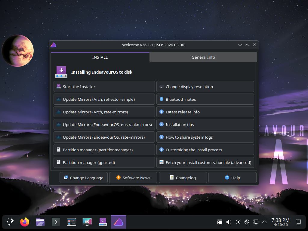 EndeavourOS má skvělou uvítací aplikaci Welcome (spustí se po startu nebo ji najdete v