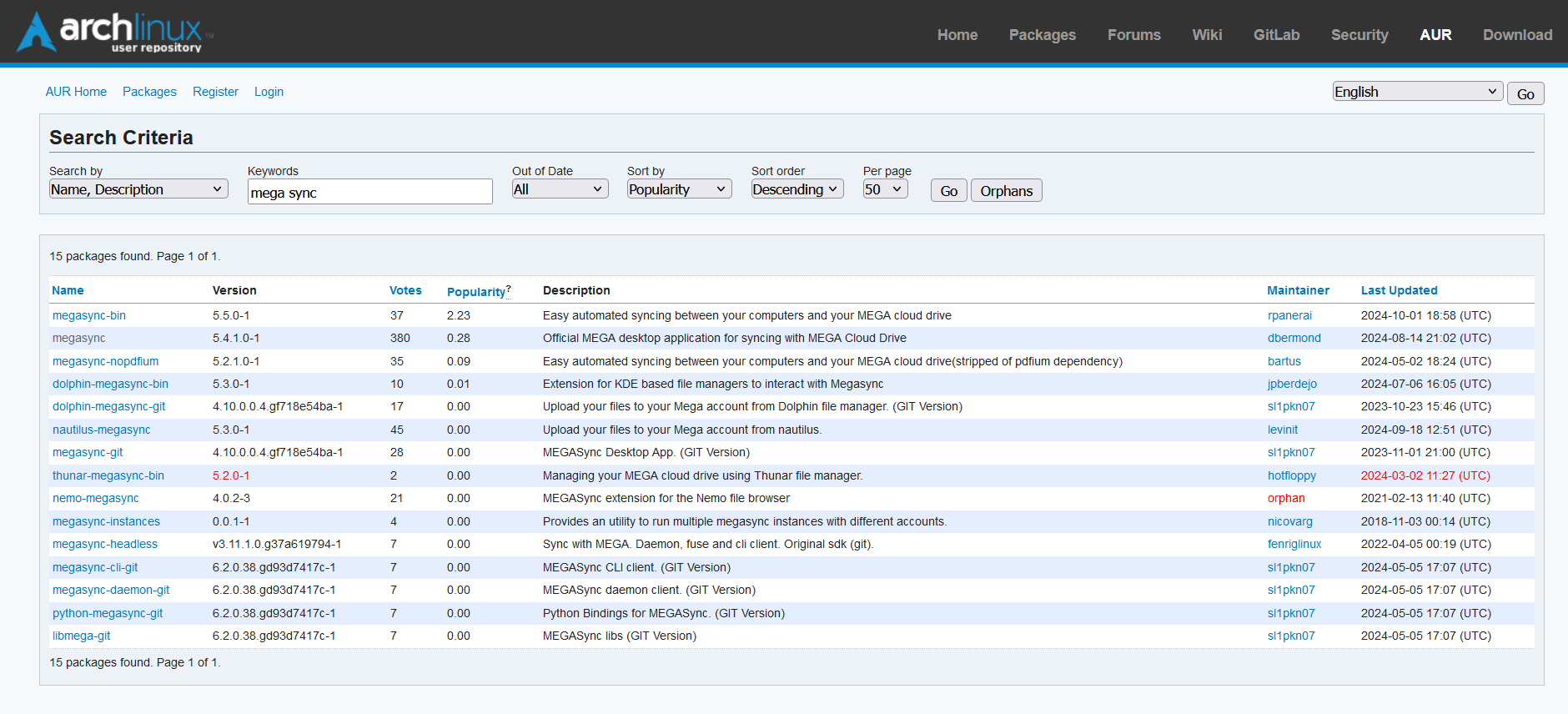 Aby jste si ověřily dostupnost Vašeho balíčku co hledáte navštivte AUR packages. Na stránce Vás bude nejvíce zajímat položka Packages, zde najdete seznam všech balíčku co si můžete nainstalovat do Vašeho OS. V kolonce Keywords můžete balíčky vyhledávat dle názvu.